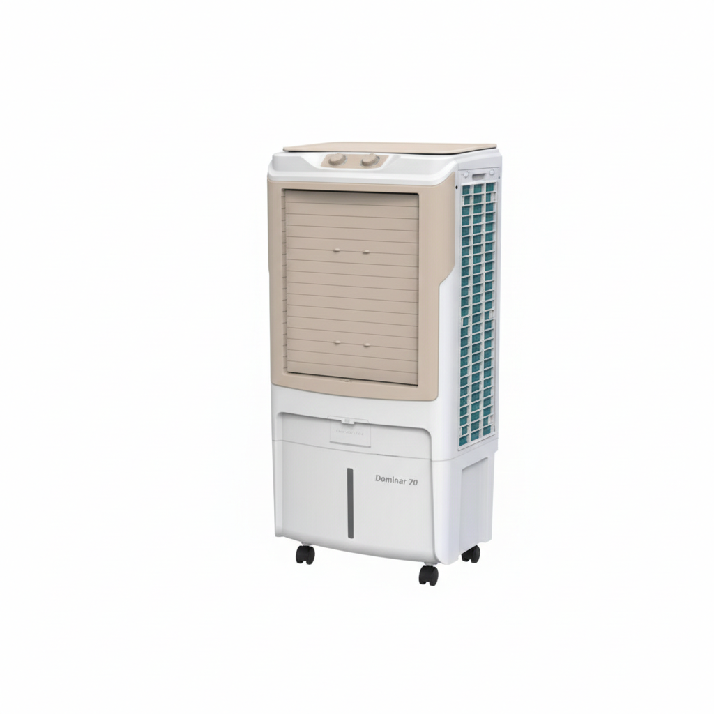 105 delivers powerful and efficient cooling for larger spaces. Hydro-dense cooling pads with Quadra Flow Technology provide an air throw of up to 50 ft (15.2 m). Consuming approximately 180 watts, it features a 16-inch powerful fan with 3-speed collapsible louvers for customized airflow. Inverter compatibility ensures uninterrupted cooling during power cuts (subject to inverter capacity). Added conveniences include a water level indicator and castor wheels.