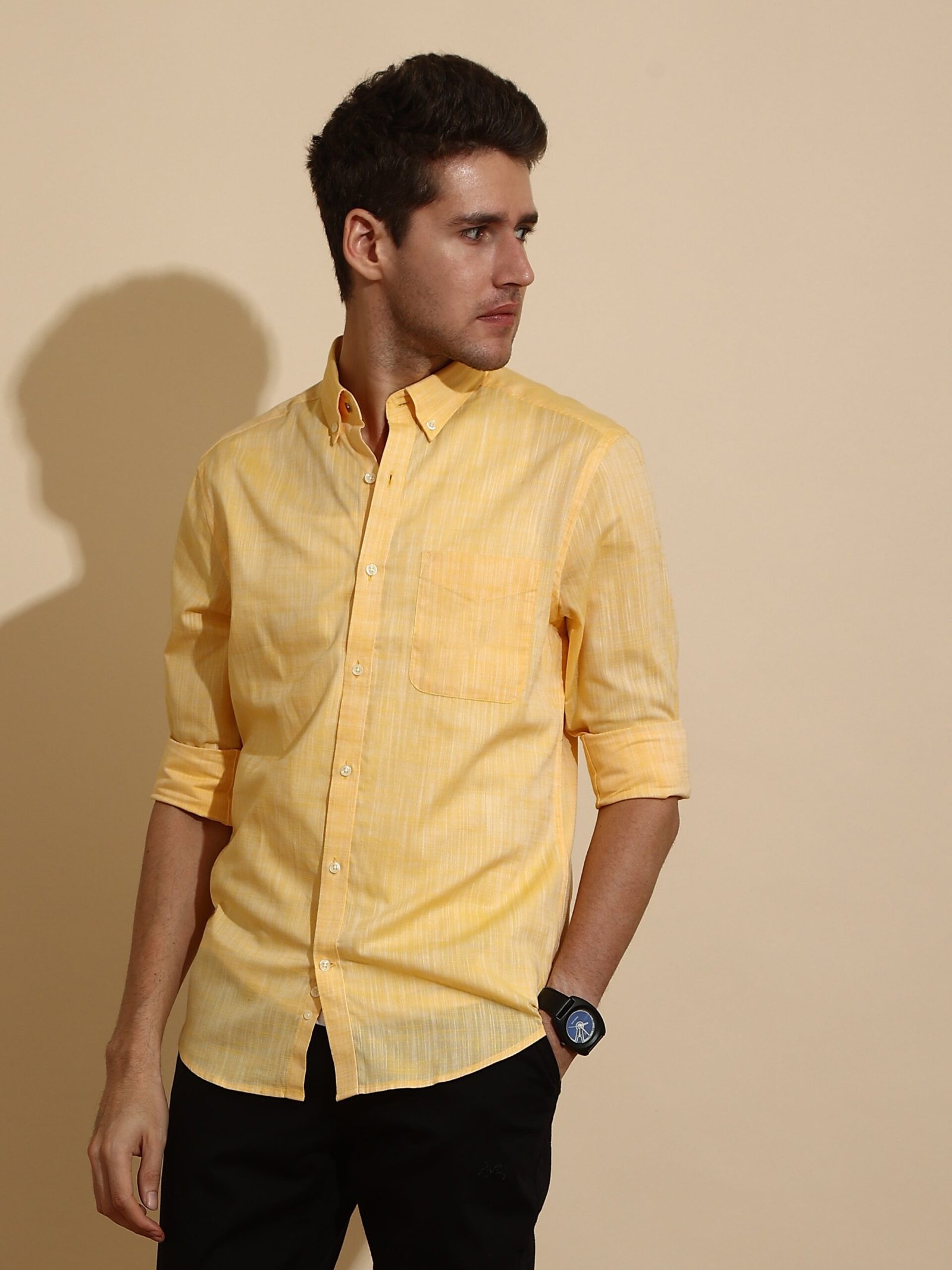 Full-Sleeve?Solid Shirt Cut And Sew Placket Regular Collar Double Button Square Cuff. Single Pocket With Logo Embroidery Curved Hemline Finest Quality Sewing Machine Wash Care Suitable To Wear With All Types Of Bottoms Made In India