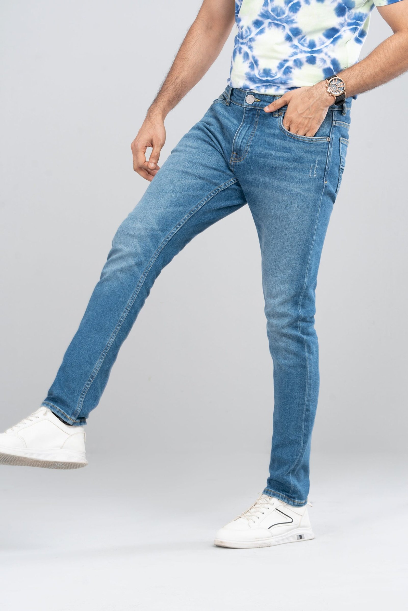Indigo fabric with coin pocket detailing and whiskering gives these jeans a smart twist.