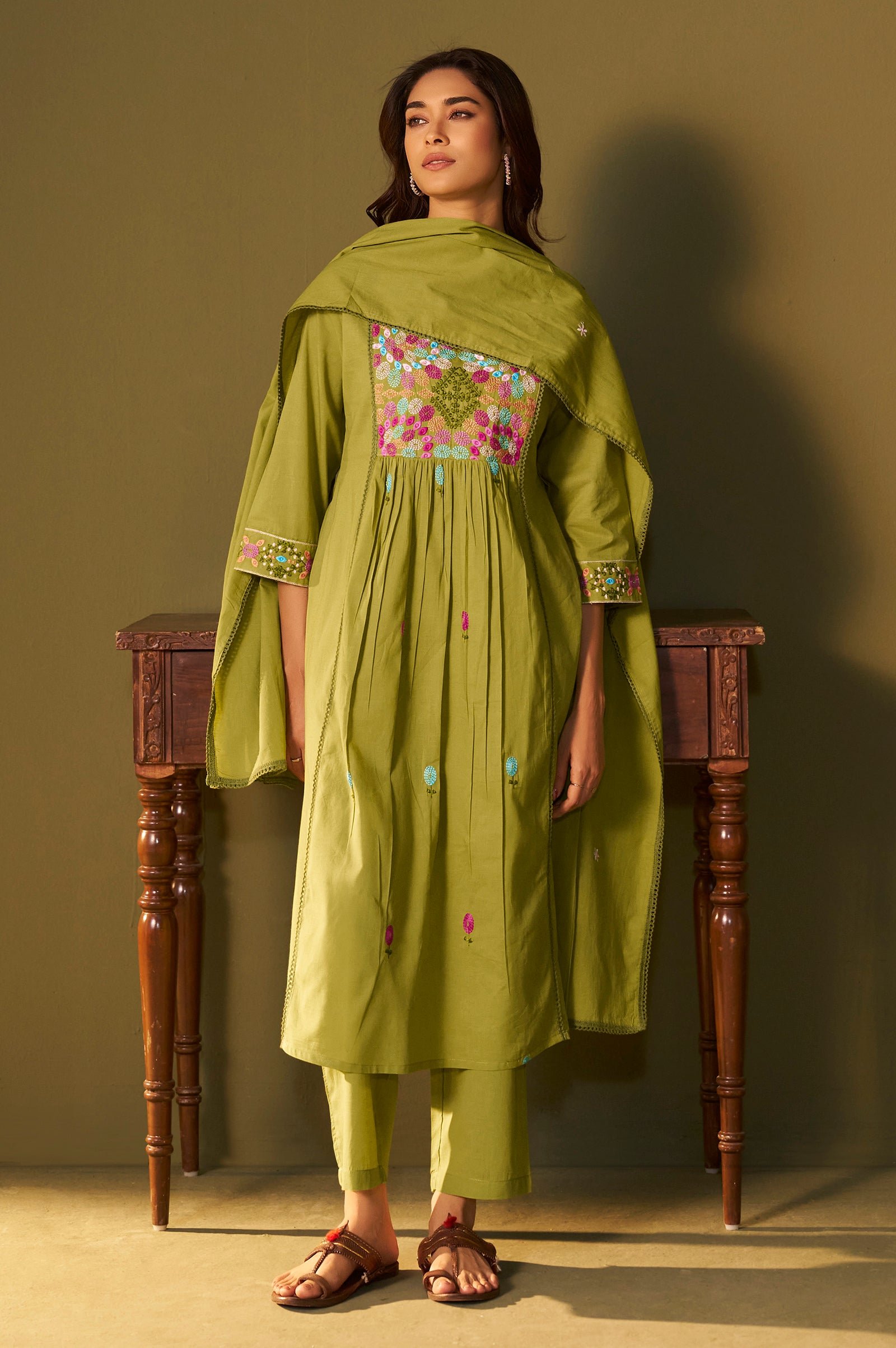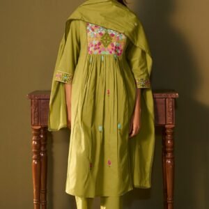 Olive Green Embroidered Anarkali Set With Dupatta For Women
